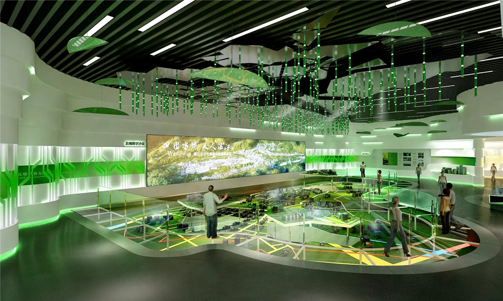 一場山水與科技的對話,是本案園田山水展廳裝修設(shè)計的重點。在現(xiàn)代、科技的手法來喚醒人們對于青山綠水的向往與珍惜,普及綠色環(huán)保城市建設(shè)理念。