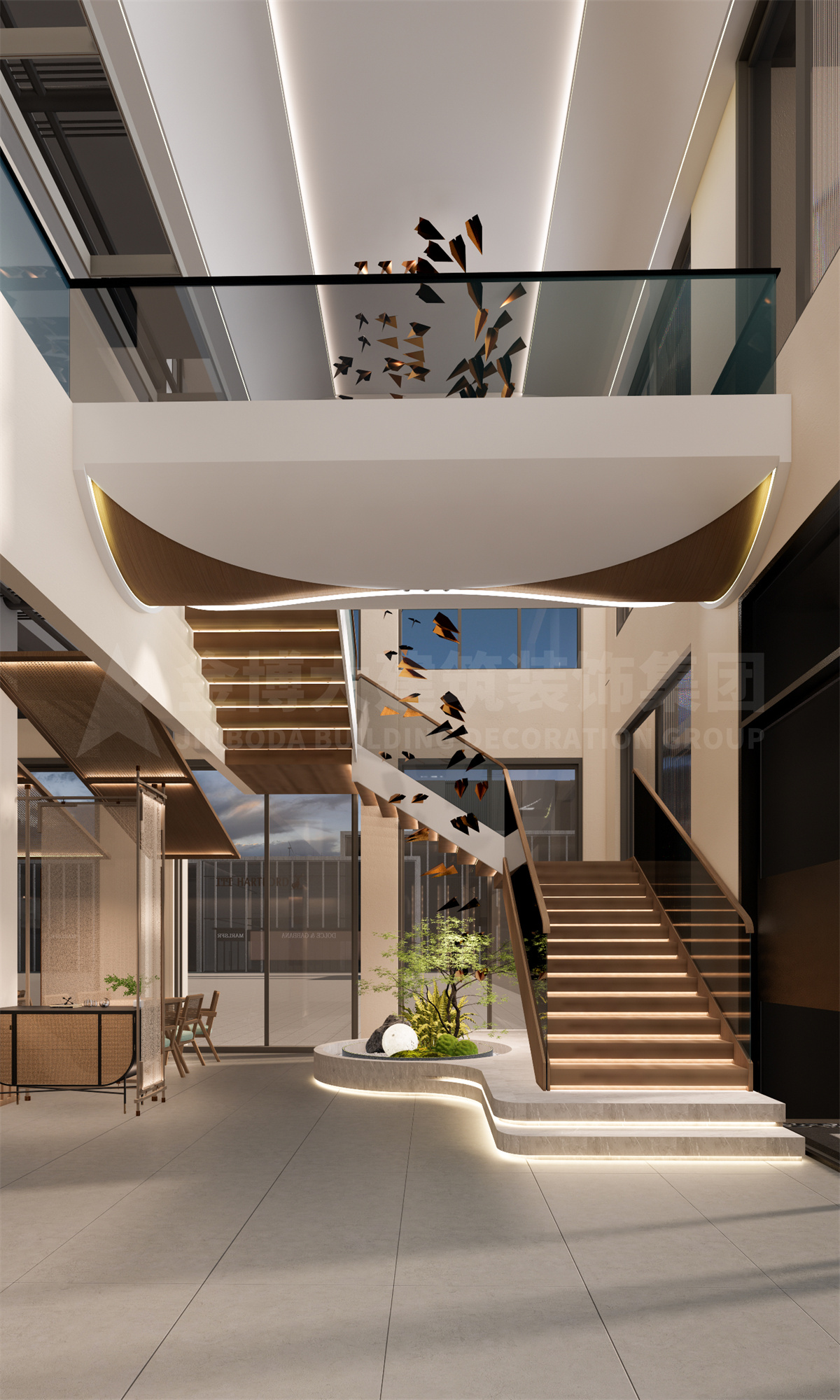 正門的logo背景墻設(shè)計(jì)為流水墻,水為財(cái),不斷流下的水象征著財(cái)源滾滾,而且進(jìn)門的水景不但柔化廣州一年四季炎熱的天氣,還會(huì)讓每個(gè)路過的顧客感到舒心。流水墻通過錯(cuò)落的水景與綠植,使得整個(gè)庭院的景觀古典又不失現(xiàn)代設(shè)計(jì)感。