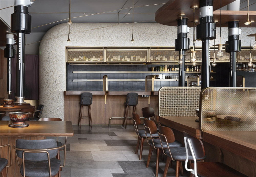 在本案燒烤餐廳裝修設(shè)計中,設(shè)計師在客區(qū)的中心區(qū)域設(shè)計了造型的環(huán)形餐桌,其桌面直通天花形成一個回環(huán),增添了空間的趣味性??拖g可以插入金屬網(wǎng)屏風進行自由的區(qū)域分隔,金屬網(wǎng)屏風能夠有效阻斷烤肉時濺起的食物飛沫,且能隨時取走清洗及消毒,靈活的進行客座區(qū)分隔。