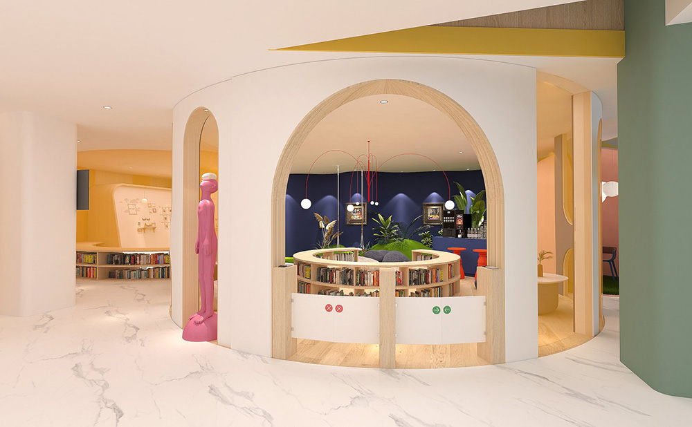 畢加索國(guó)際美術(shù)教育中心是集藝術(shù)館、咖啡區(qū)、繪本等候區(qū)、洽談室、休息區(qū)、廚房區(qū)、畫(huà)室、老師辦公室及多個(gè)教室于一體的大型國(guó)際美術(shù)教育中心。在1800㎡的空間內(nèi)的每個(gè)區(qū)域我們都采用不同的配色與材質(zhì)做區(qū)分,大量原木材質(zhì)的吧臺(tái)、書(shū)柜、裝飾穿插其中,既協(xié)調(diào)了整個(gè)空間亦給人一種溫暖的視覺(jué)觀感。