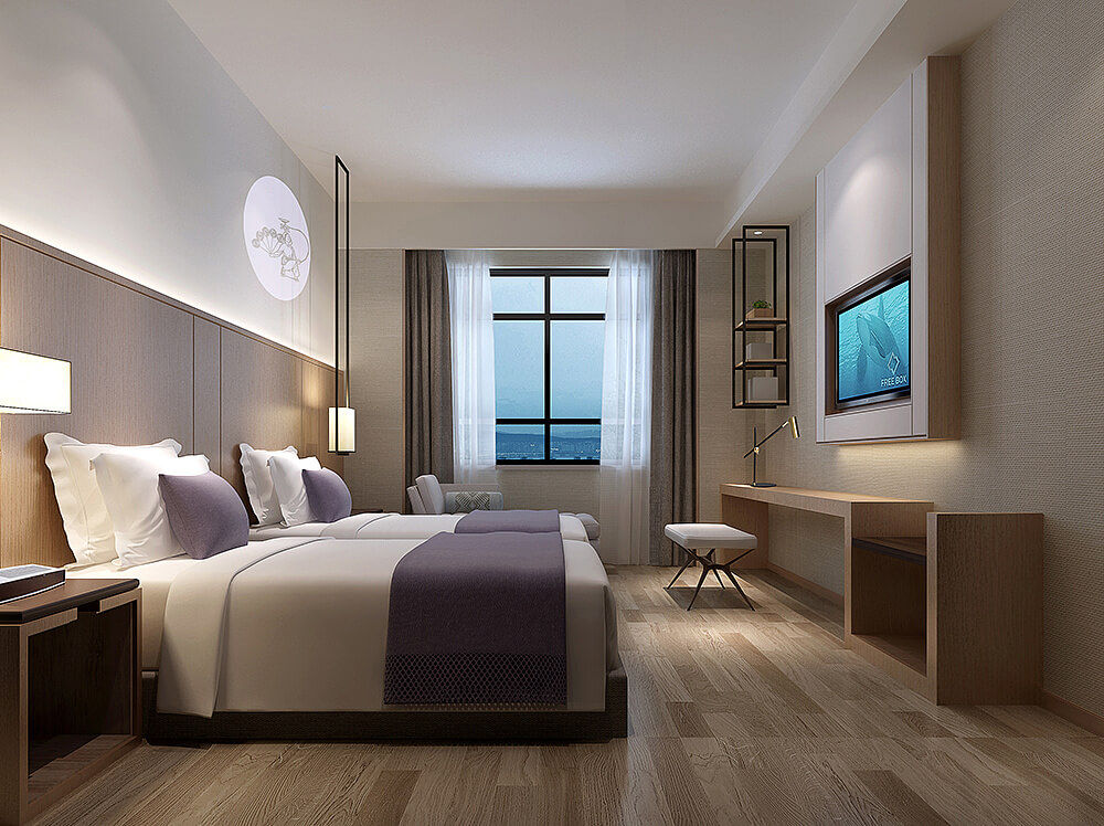 本案開封輕驛商務酒店裝修設計案例,酒店整體采用石材與原木裝飾,沒有添加任何點綴,讓原始的材質(zhì)之美植入人心。對于酒店客房的色彩設計,則使用了淺色系的色彩,可以讓顧客感受到舒適恬靜。