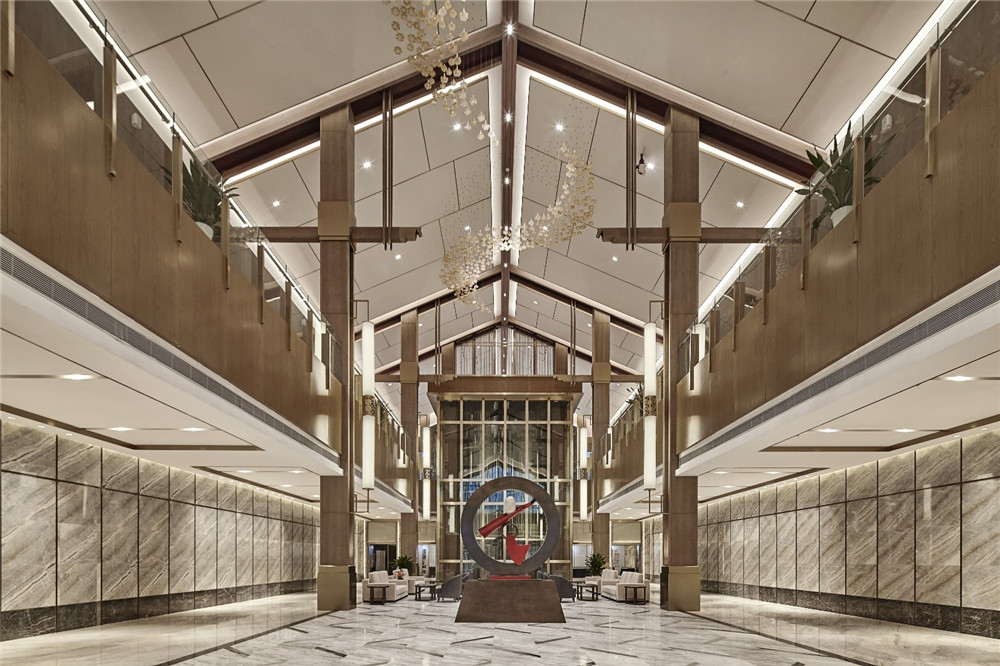 貴州遵義格蘭云天五星級酒店裝修以遵義市花映山紅為酒店主要設計裝飾元素,結(jié)合傳統(tǒng)中式建筑桁架結(jié)構,融入當?shù)靥厣幕?,營造出恢弘大氣的空間氛圍。