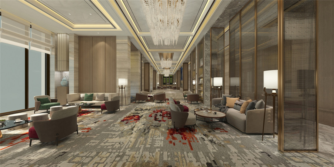 新誠國際酒店裝修設(shè)計從駝人集團文化中提取出沙漠綠洲(希望)、駝人之光(引領(lǐng))、駝鈴精神(旋律)、一帶一路(前行)等元素,打造了一個具有國際化視野、新東方中式風采商務(wù)酒店空間。酒店大堂接待區(qū)背景選取意化的山峰與駱駝,代表了駝人集團砥礪前行的開拓精神。在酒店軟裝設(shè)計中,富有地方特色的豫劇、汴繡、汝瓷等元素都成為空間中的點睛之筆。