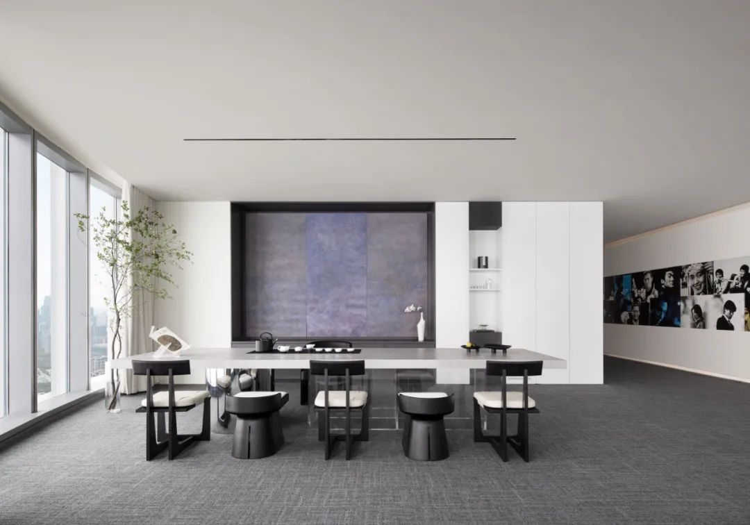 開(kāi)放式布局打破空間界限,可容納多人交流會(huì)談,窗外城市江景映入空間內(nèi),豁達(dá)的氣質(zhì)迎面而來(lái),恰如其分地展現(xiàn)出主人的性格特點(diǎn),在一間屬于自己的空間中辦公,享受工作與生活之間平衡的樂(lè)趣。悠悠歲月,星光璀璨,一面弧形墻面中滿是時(shí)光的痕跡,以黑白人物照片代替公司文化,寓意這里的無(wú)限可能,憧憬更加生生不息的美好未來(lái)。