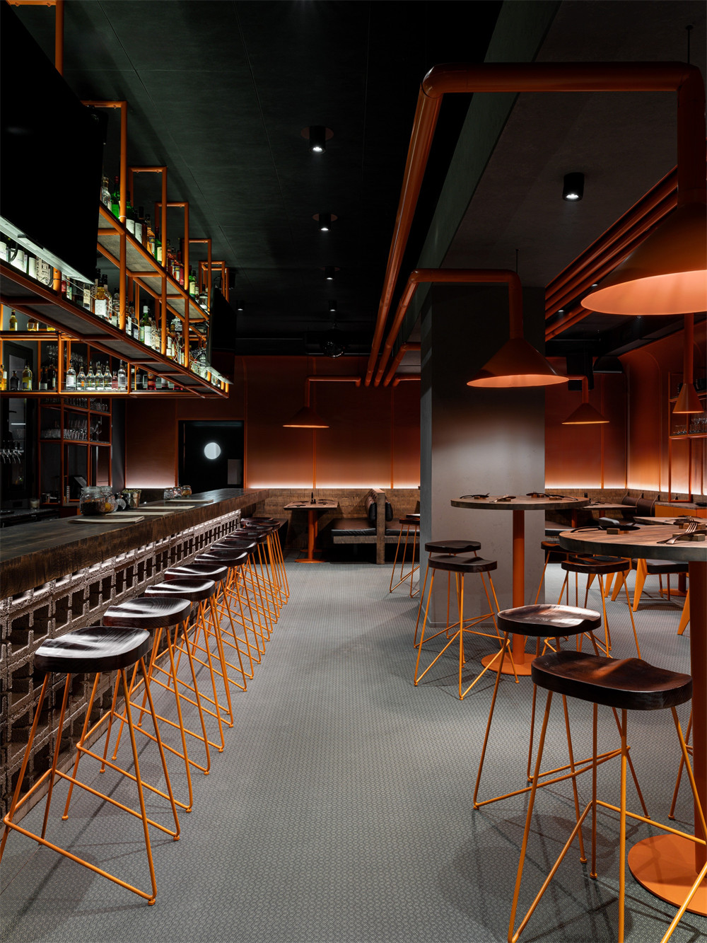 燒烤店裝修設(shè)計中使用的兩種主要材料——混凝土和金屬——支持了內(nèi)部的簡單性。色塊技術(shù)使空間形成對比:冷灰色的基底與亮橙色的點綴——燈具、金屬墻、底框等元素融為一體。