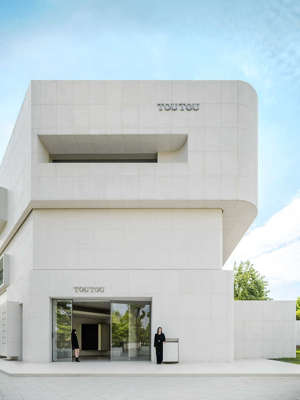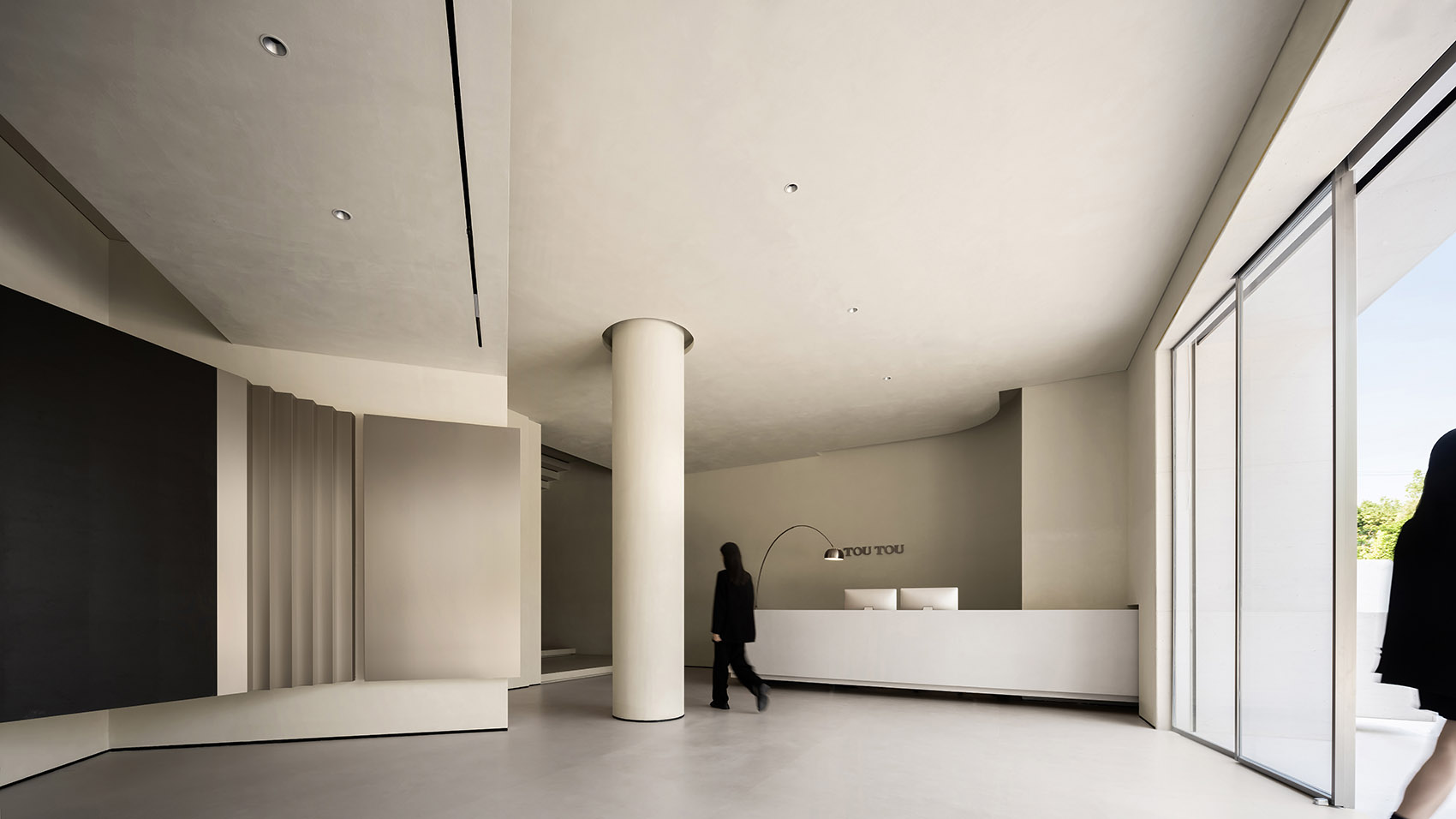 作為電商企業(yè),TOUTOU需要有充足且多樣的攝影空間服務(wù)于產(chǎn)品的宣發(fā)。辦公場(chǎng)地以二、三樓為主,一樓僅作為形象展示及入戶大廳使用。辦公設(shè)計(jì)團(tuán)隊(duì)選擇將臨街入戶門封閉,將西北向大門作為主要入口。盡量規(guī)避入口正對(duì)街道車流的不利影響,同時(shí)擴(kuò)大入口,以更開(kāi)放的姿態(tài)迎接員工與參觀者。化中廳方柱為圓,削弱陽(yáng)角的尖銳感,柔化整個(gè)大廳的感受。懸空前臺(tái)貫穿室內(nèi)外,打破室內(nèi)外分隔,增強(qiáng)室內(nèi)外互動(dòng)感。