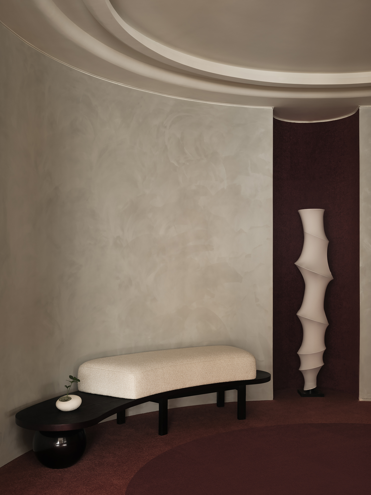 蕓初十悅位于一棟傳統(tǒng)的柱網(wǎng)結(jié)構(gòu)建筑內(nèi),設(shè)計師巧妙地將細胞裂變的生物學(xué)原理融入空間設(shè)計中,通過不同大小的圓形重新構(gòu)筑空間布局,打破了直角空間的尖銳與冰冷,柔化了空間自身的情緒,使之更加柔和松弛,同時營造了豐富的美學(xué)線條和空間層次感。