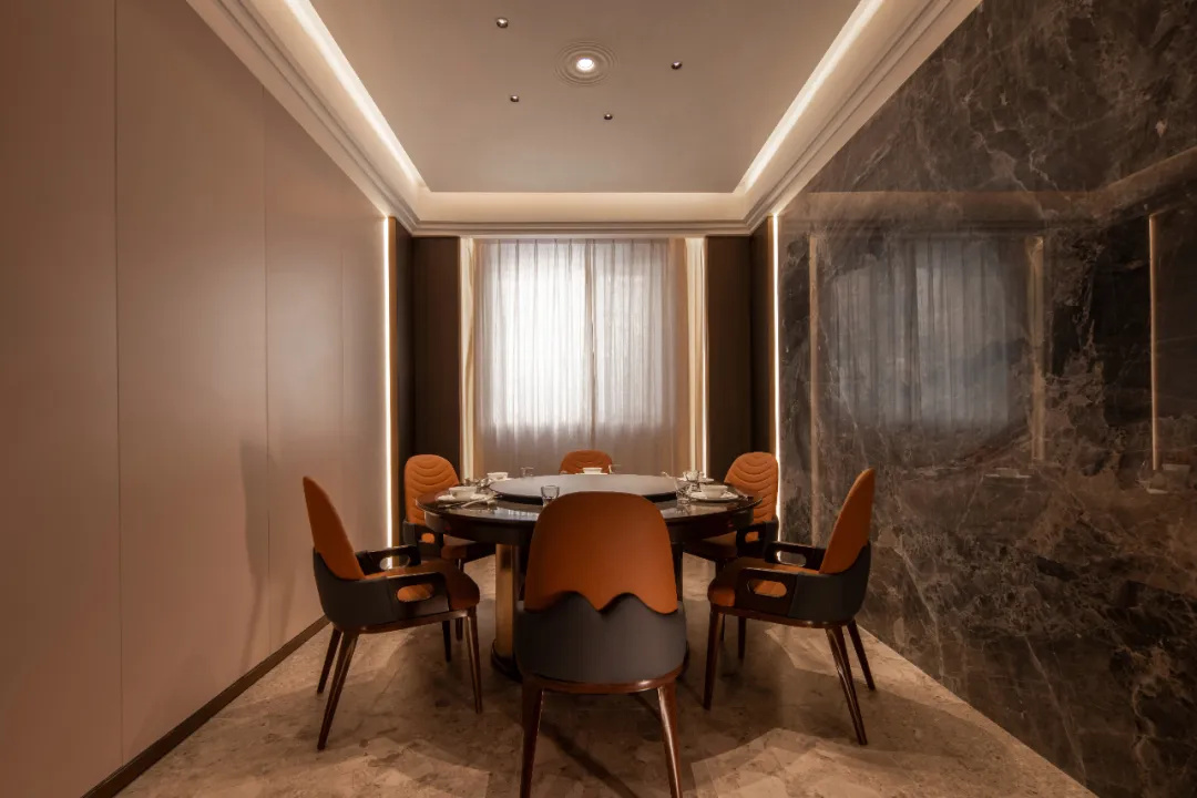天然石材、啞光金屬與木質(zhì)元素的結(jié)合,賦予空間克制的奢華。包房強(qiáng)調(diào)更加穩(wěn)定的商務(wù)體驗(yàn),材質(zhì)的觸感與溫度,進(jìn)入空間的瞬間,感受到一種無聲的儀式感,空間承載的不止是一桌美味,更是體驗(yàn)環(huán)境對(duì)情緒的觸動(dòng),多一份自在和舒適。