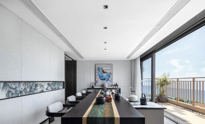 茶室位于整個(gè)空間海景視野最好的區(qū)域,推開利落敞亮的移門就能直接與海景親密相擁,眺望煙波浩渺的水岸,海風(fēng)柔柔的輕撫臉頰,感受海浪拍打巖石的力量,舒適放松。在海與光的陪伴下變得溫柔靜謐,若閑來無事,上一盞茶,與好友兩三慵懶而坐夜話百家談,將都市的疲憊于此處釋放與舒展。