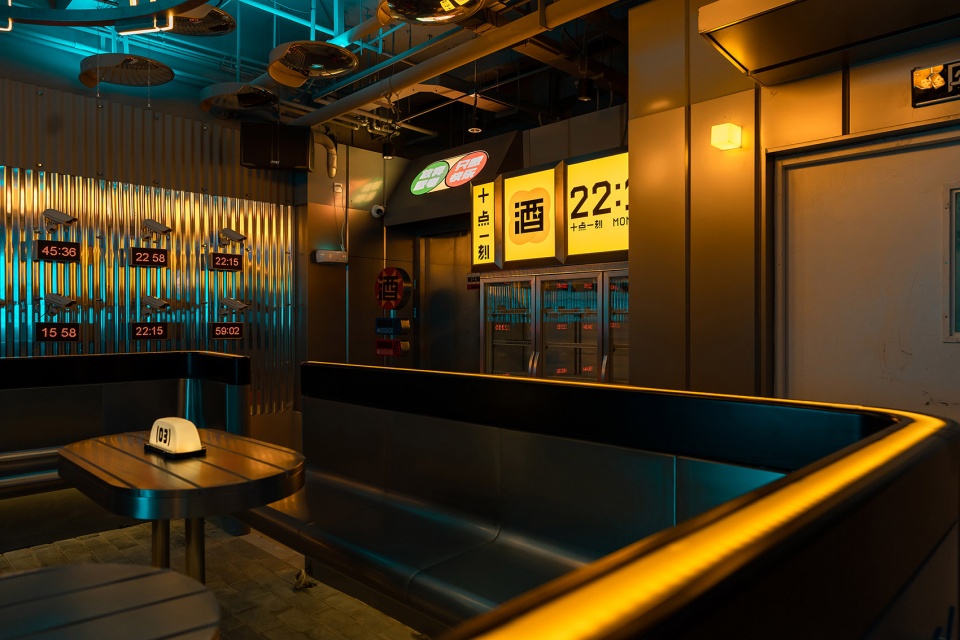 一樓,我們將城市公園和街頭元素融入空間,年輕人可以在這樣一個“放松”的場景中更加自由的社交與釋放。入口處墻面陣列的攝像頭裝置和計時器反映著當(dāng)下每個人都身處于一個無時無刻被監(jiān)控的時代,但同時Z世代的年輕人們又都渴望通過“攝像頭”分享自己的生活有趣和個性,并被更多人看到自己的”獨特”??臻g正中的客座區(qū)環(huán)繞一顆繁茂的綠植排布,在低暗的氛圍光中這顆綠植仿佛賽博廢土中生出的希望。