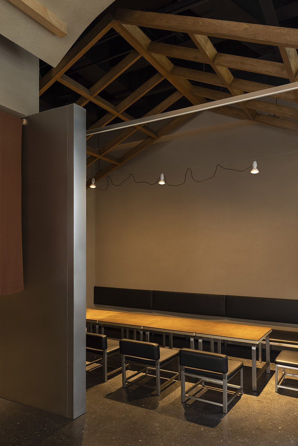 通過(guò)走廊可以看到,包間內(nèi)傾斜的木梁天花板搭建了一個(gè)屋頂?shù)男问?,將這個(gè)空間分割成一個(gè)個(gè)獨(dú)立的空間,提醒人們這是一個(gè)可以享受私密空間的區(qū)域。