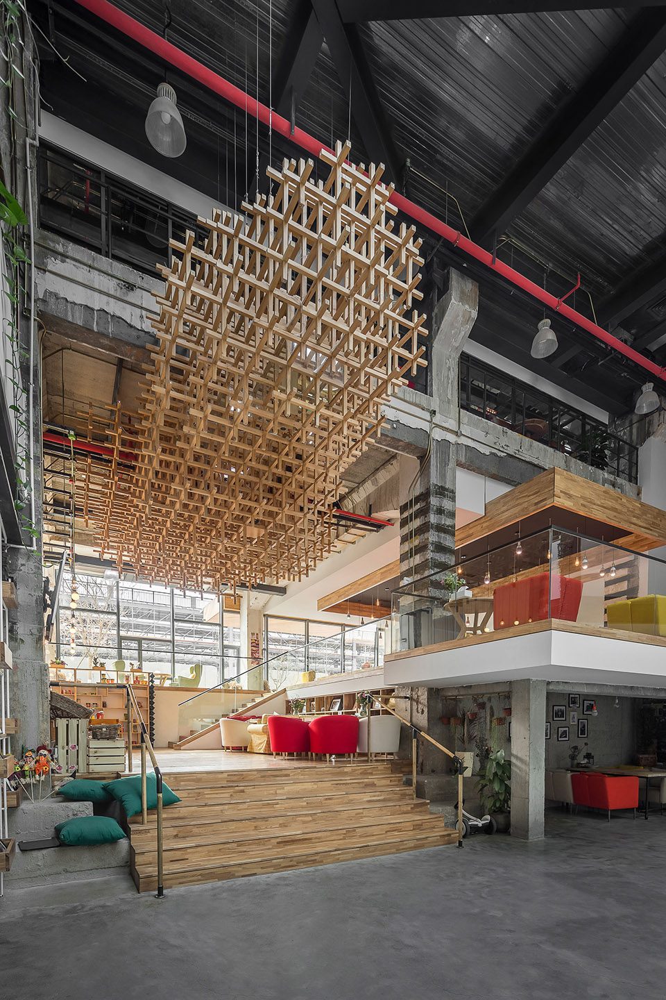 辦公空間位于舊廠房內(nèi),縱深為80米。