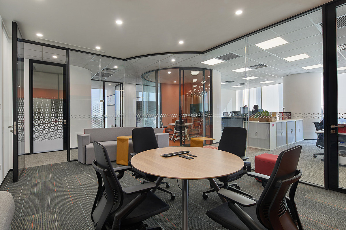 除了企業(yè)形象色在空間中的運(yùn)用外,由企業(yè)logo的三角形演變的設(shè)計(jì)語言也在空間中完美書寫著企業(yè)文化,比如前廳頂面的三角形格柵、會(huì)議室和pantry墻面的三角形吸音板拼接圖案以及展廳的三角形展臺(tái)等,它們都用相同的形狀作為載體但是通過不同的顏色、材質(zhì)來表達(dá)共同的企業(yè)特性。