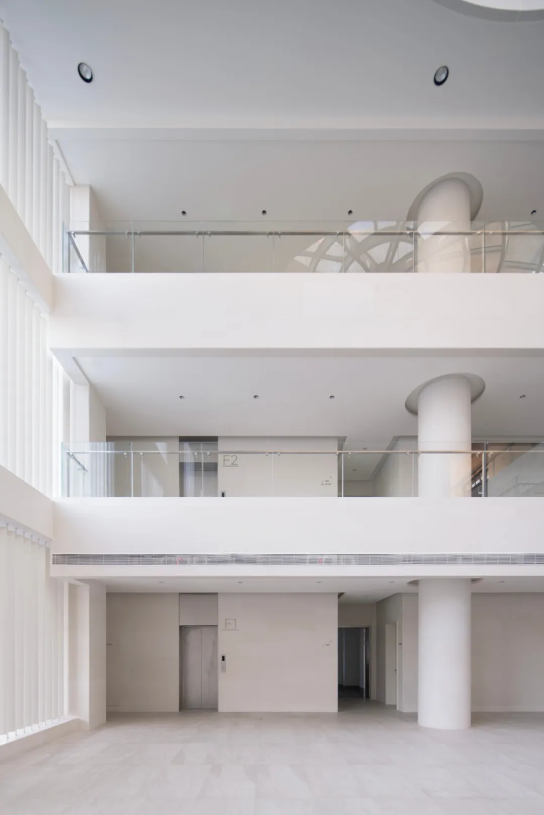 大堂的南立面的改造,我們?cè)黾恿送ǜ叩匿X格柵百葉,格柵的角度根據(jù)太陽(yáng)的入射角進(jìn)行設(shè)計(jì),每一片的角度都略有不同。不僅可以用來(lái)柔化陽(yáng)光,改善室內(nèi)辦公的光環(huán)境,而且結(jié)合室內(nèi)的整體純凈色調(diào),營(yíng)造一種極致的簡(jiǎn)約感。大堂的墻面和地面采用顏色接近的大地色系倍砼石及意大利進(jìn)口地磚材料,營(yíng)造極致的整體感,這里除了建筑結(jié)構(gòu)本身以外,參與其中的就是不斷變化的天光。這里是一個(gè)能讓人在精神上感受純粹的地方,員工都不禁感嘆,這是把藝術(shù)館搬進(jìn)了辦公室。在這里,一些空間可以是“無(wú)限的”,但也有一些空間就應(yīng)該完全地“有限”。雖然大堂沒(méi)有設(shè)置讓人停留的空間,但是這種近乎于美術(shù)館的精致、簡(jiǎn)約,就足以讓人主動(dòng)駐足。立體的樓梯與層疊的走廊,也讓員工在豎向?qū)用娑嗔烁嗟呐加雠c交互。