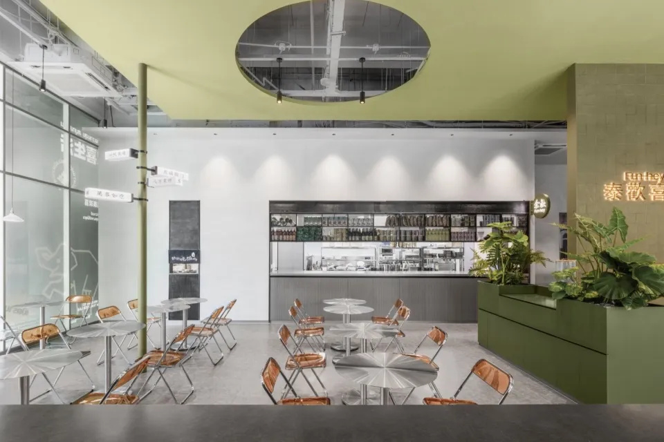 本項目打造了一個環(huán)境舒適,功能多樣的餐飲空間,在設(shè)計早期階段把主要使用人群,即周邊聚集型辦公樓人群納入考慮,提供了餐飲午歇和會面聚會的功能空間,應(yīng)對多種社交使用需求。Fun-hey泰餐廳是一家迎合當(dāng)下年輕消費群體對餐飲需求的餐飲店。造型概念來源于快餐飲的消費流程,即等位-短暫停留-帶走的模式。希望能提供給乘客短暫停留的景觀巴士站,整個泰餐廳裝修設(shè)計作為一個美食小站,食客們能在輕松氛圍大快朵頤。